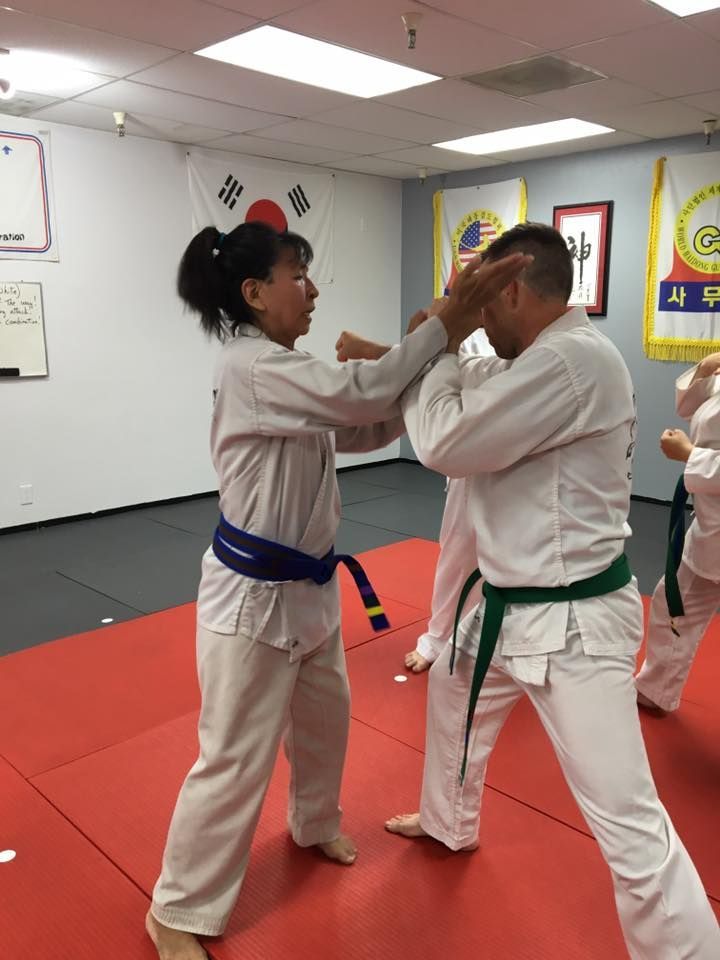 After the instructional demonstration, Adults will practice these techniques with a partner or on punching bags/pads to improve their form and self defense techniques.